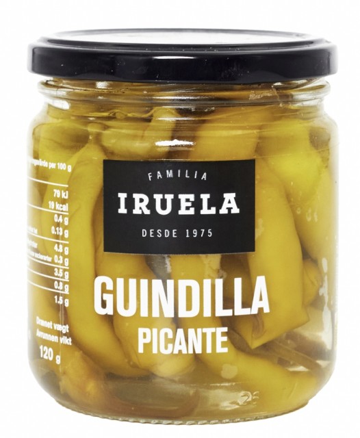 Guindillas grønn spansk chili i lake, 120g Guindillapeppers fra familiebedriften Iruela utenfor Barcelona – en klassisk baskisk favoritt. De avlange grønne pepperfruktene har en frisk syrlighet og mild styrke som også følsomme ganer setter pris på. NOK59,00 inkl. mva. På lager Kjøp Del dette Produktinfo Syltet i eddikelage som holder dem sprø, friske og fulle av smak. Uunnværlig til tapas med oliven og ansjos. Avrent vekt: 120 g.