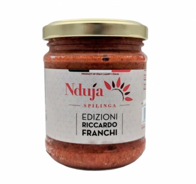 Nduja Spilinga 180g glass, Edizioni Franchi Smørbar, krydret og uimotståelig! Nduja di Spilinga er Calabrias hete stolthet – en myk salami med rikelig chili og dyp umami. Perfekt på bruschetta, som pizzatopping eller rørt inn i pastasausen for ekstra piff. NOK209,00 inkl. mva. På lager Kjøp Del dette Produktinfo Rett fra hjertet av Sør-Italia – ekte smak, ekte varme. Produktet trenger ikke stå kjølig! Nduja di Spilinga er en av Sør-Italias mest karakteristiske delikatesser – en smørbar salami med røtter i den lille byen Spilinga i Calabria. Den lages av svinekjøtt og en generøs mengde lokal chili, noe som gir den en intens, røkt og krydret smak. Konsistensen er myk og kremet, noe som gjør den ideell til å smøre på ristet brød, blande inn i pastasauser eller bruke som pizzatopping. Riccardo Franchi, med sin bakgrunn som produsent og nå som kvalitetsutvelger, har en unik evne til å finne de beste variantene av italienske spekematprodukter. Hans nære samarbeid med produsenter i Calabria sikrer at Nduja di Spilinga som tilbys gjennom Edizioni Riccardo Franchi, holder høyeste kvalitet. Dette produktet er et resultat av lidenskap for tradisjon og en søken etter autentiske smaker. Enten du ønsker å tilføre litt varme til en rett eller nyte den som den er, bringer Nduja di Spilinga ekte italiensk sjel til bordet.