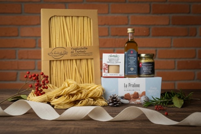 Trøffel Gourmet, Smakslykkes Trøffelpakke For den som elsker italiensk luksus på sitt beste - en komplett smaksreise med trøffel og gourmetglede i hver detalj. NOK740,00 inkl. mva. På lager Kjøp Del dette Produktinfo Tagliatelle eggpasta med trøffel 250 g. Tagliatelle med trøffel – båndpasta 4 mm bredde. Calugi Sort Trøffelolje 60 ml. En ekstra virgin olivenolje med delikat smak av sort trøffel - foredlet av familiebedriften Stefania Calugi, som i generasjoner har perfeksjonert kunsten å fange den rene, naturlige og aromatiske smaken av ekte trøffel. Calugi Smør med Hvit Trøffel 30 g. Et luksuriøst trøffelsmør laget med to typer hvit trøffel – den sjeldne Alba-trøffelen og Tuber Borchii – foredlet av familiebedriften Stefania Calugi. Parmesankrem med trøffel 90 g. Perfeksjon til pasta, gnocchi, vendt inn i risotto, og selvfølgelig bruscetta toppet med prosciutto di parma. Trøffelsjokolade 200 g. Trøflene er rullet i kakaopulver og smelter i munnen. (Assortert utvalg av smak av havsalt, appelsin og bringebær) Følger med silkepapir, coellefan, smakslykke klistremerke og gavebånd.